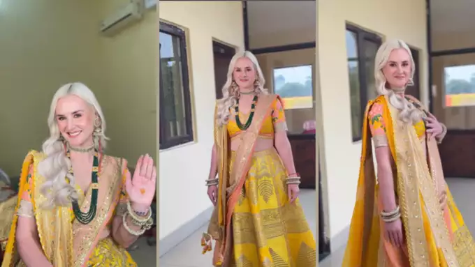Dr. Paige Reilly selected a lehenga from Masaba Gupta's label House of Masaba for her Mehndi ceremony. While every bud of the yellow lehenga has a leaf-like design made of sequin stars, which was kept light weight. Along with this, she wore a V-neckline half sleeves choli. Which has a pink and white floral print.