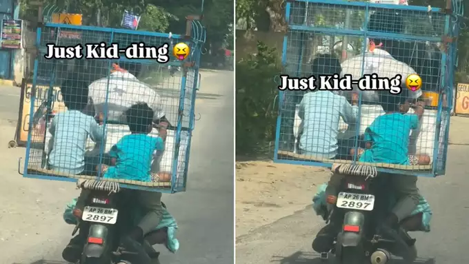 In this video, a man is taking two small children in a chicken cage on his bike. This video has been shared by a Telugu rapper Roll Rida on his Instagram account. In the video, it is seen that a big cage is tied behind the man's bike and two children are sitting comfortably in it. It seems as if the cage has been specially made and installed as a seat for the children.